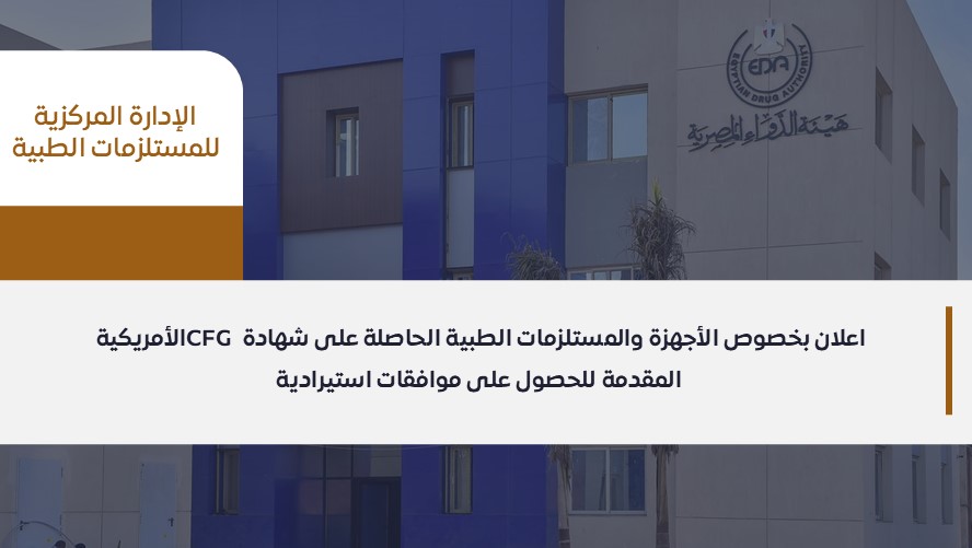 وذلك فيما يخص الأجهزة والمستلزمات الطبية الحاصلة على شهادة CFG الأمريكية الصادرة من USFDAوالمقدمة للادارة المركزية للمستلزمات الطبية للحصول على موافقات استيرادية لها،