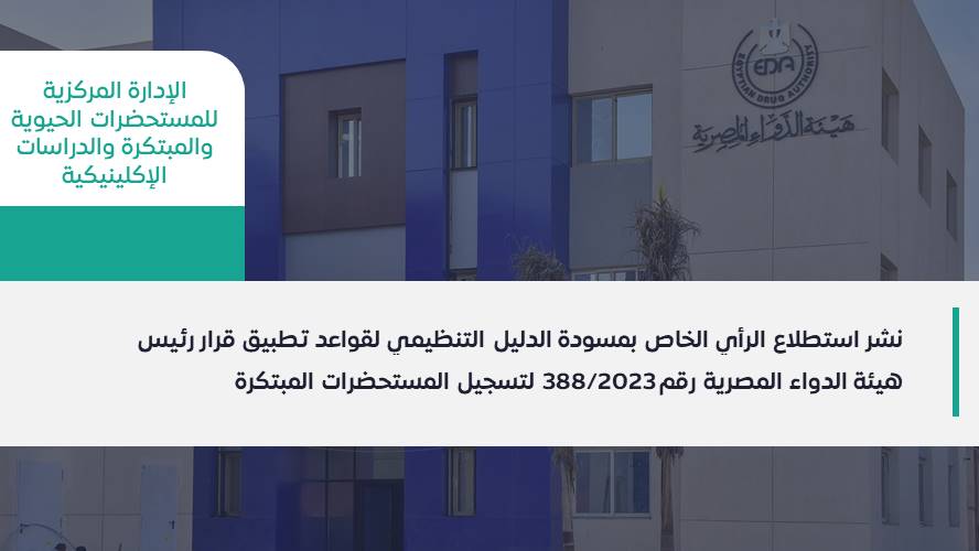 نشر استطلاع الرأي الخاص بمسودة الدليل التنظيمي لقواعد تطبيق قرار رئيس هيئة الدواء المصرية رقم ٣٨٨/٢٠٢٣ لتسجيل المستحضرات المبتكرة