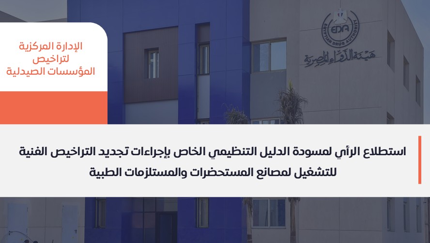 هيئة الدواء المصرية تعلن فتح باب استطلاع الرأي لمسودة الدليل التنظيمي الخاص بإجراءات تجديد التراخيص الفنية للتشغيل لمصانع المستحضرات والمستلزمات الطبية