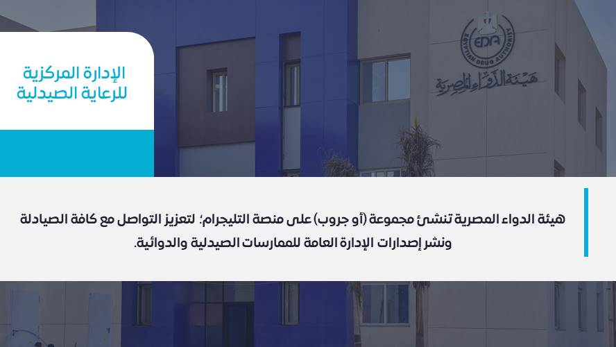 هيئة الدواء المصرية تنشئ مجموعة (أو جروب) على منصة التليجرام؛ لتعزيز التواصل مع كافة الصيادلة ونشر إصدارات الإدارة العامة للممارسات الصيدلية والدوائية.