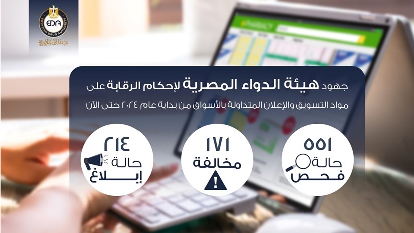 أعلنت هيئة الدواء المصرية إصدار 171 مخالفة بخصوص مواد التسويق والإعلان المتداولة بسوق الدواء منذ بداية العام الجاري، وأنه تم استقبال 214 إبلاغ عن مواد تسويقية مخالفة أو غير ملائمة، وفحص 551 مادة تسويقية منشورة ومتداولة من خلال الصفحات والمواقع الإلكترونية بالسوق الدوائية.