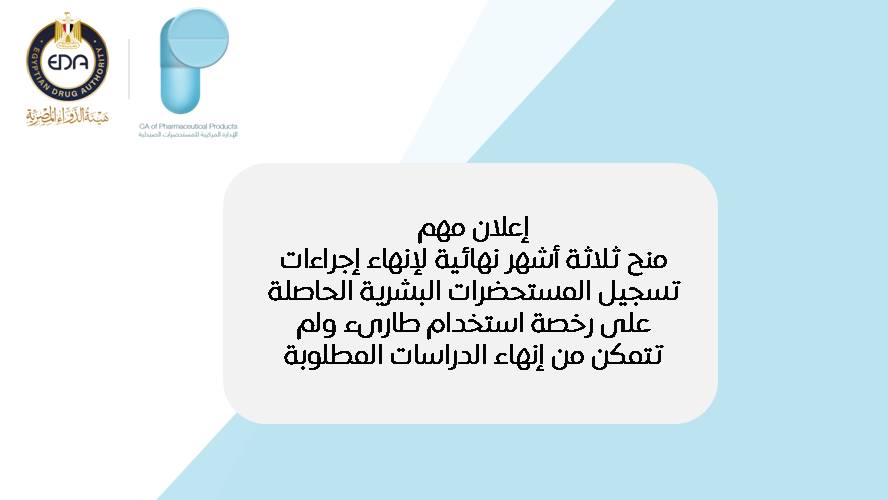 إعلان هام منح ثلاثة أشهر نهائية لإنهاء إجراءات تسجيل المستحضرات البشرية الحاصلة على رخصة استخدام طارىء ولم تتمكن من إنهاء الدراسات المطلوبة